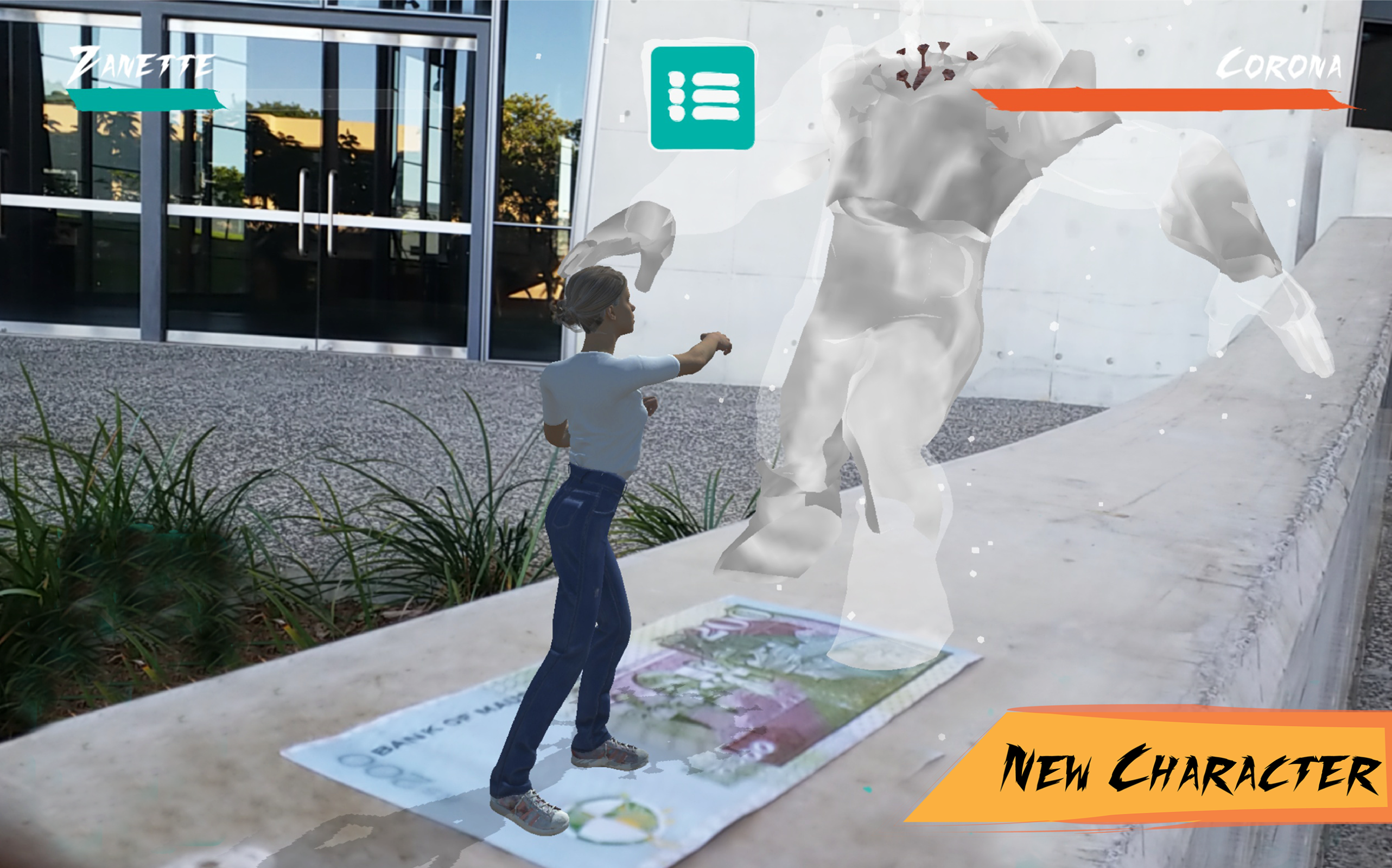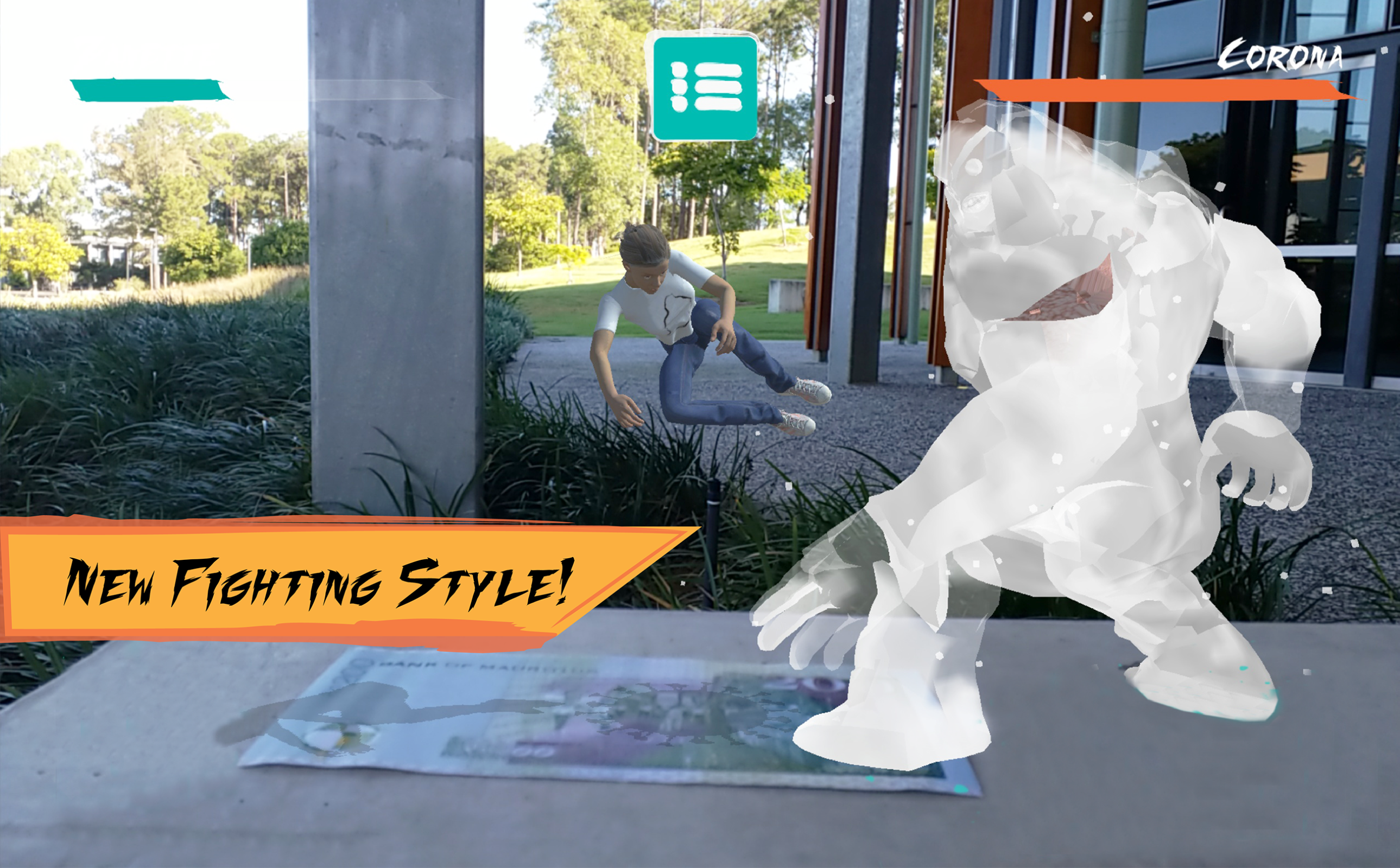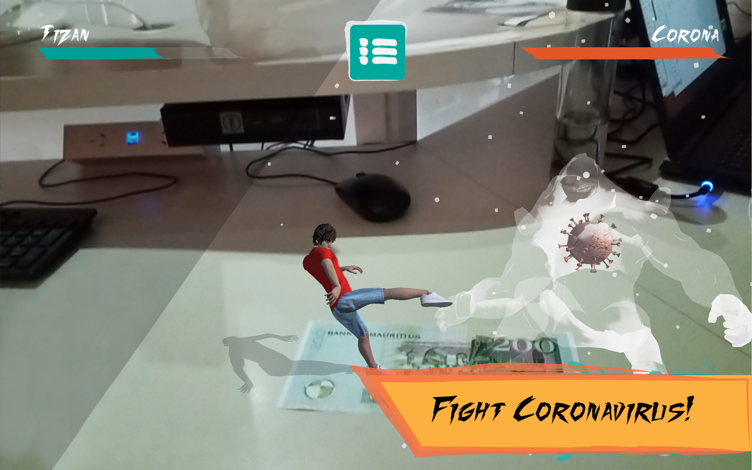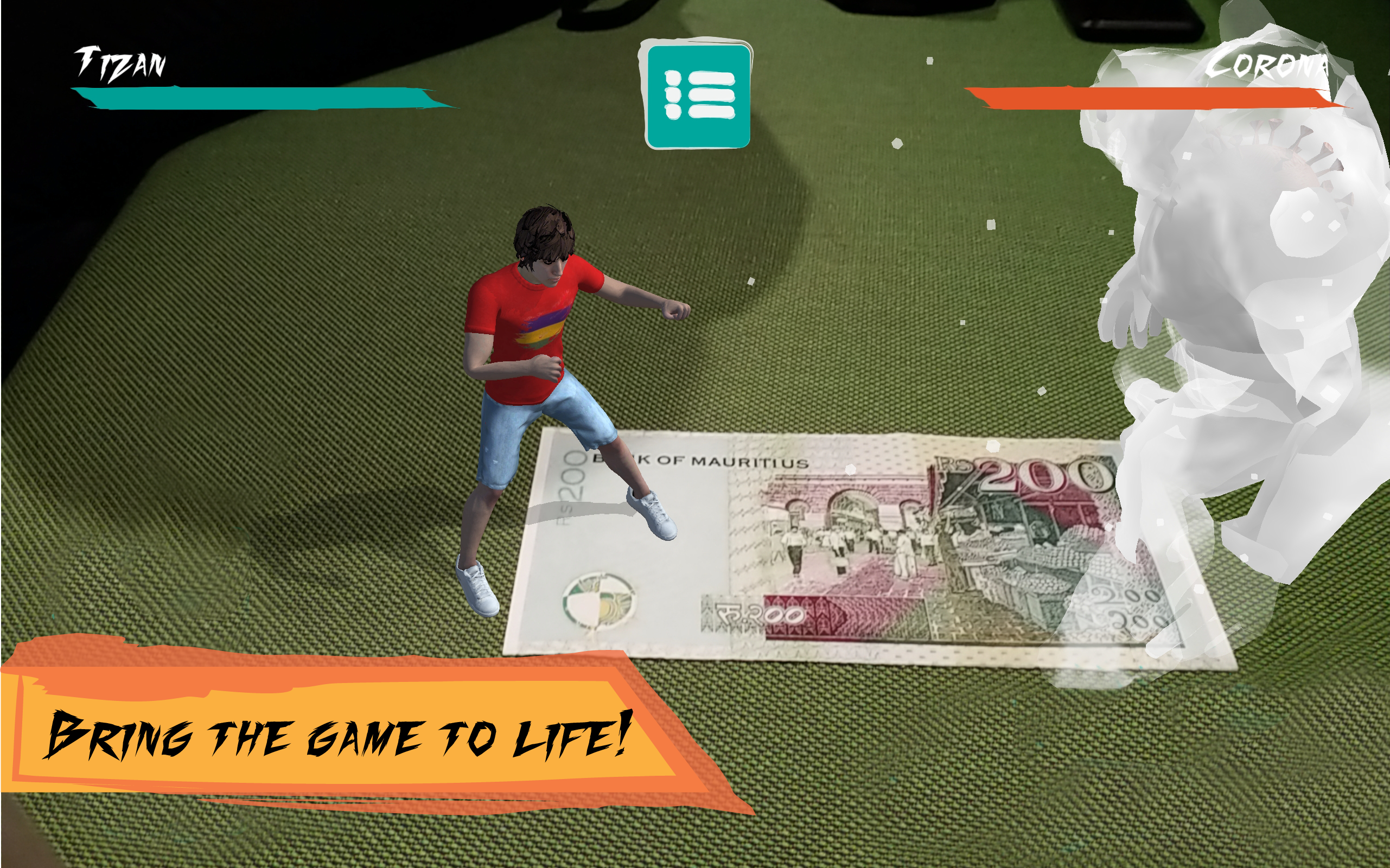AR-CADE is a game which takes the genre to a whole new level. It uses augmented reality to bring the game to the real world. The Rs 200 Mauritian note illustrated is used as a place-mark to generated the characters. The opponent represents the disease pandemic with the virus at the centre which breathes life in the monster. The note was used to symbolise the unhygienic state of notes with the virus materialising from it.